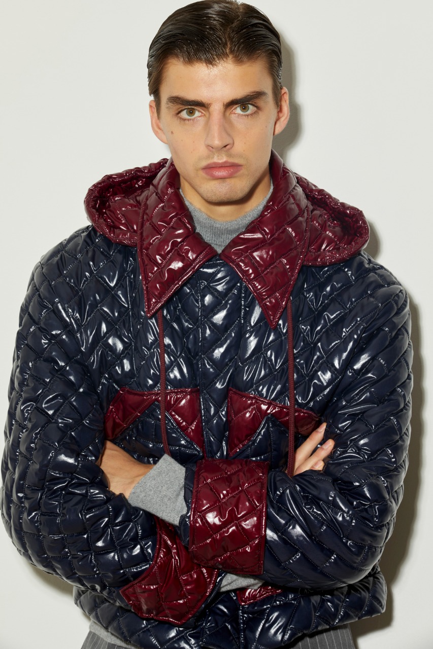يُفضل معظم الشباب اعتماد الجواكيت المضادة للمطر بإختلاف تصاميمها وألوانها و قد أعجبنا هذا الطقم من ماركة Aknvas من جاكيت مصنوع من المادة المضادة للمطر باللون الكحلي ذو ياقة عريضة و كابيشون باللون الأحمر القاني و صُممت الأساور باللون الأحمر القاني أيضاً مع الجيوب الأمامية الصغيرة ومنسدل منه حزام من القماش بنفس اللون و يمكنك اعتماد توب بياقة عالية من القطن باللون الرمادي و سروال جينز ضيق باللون الأزرق الداكن .