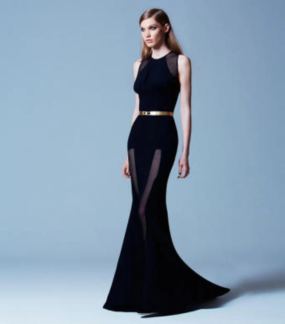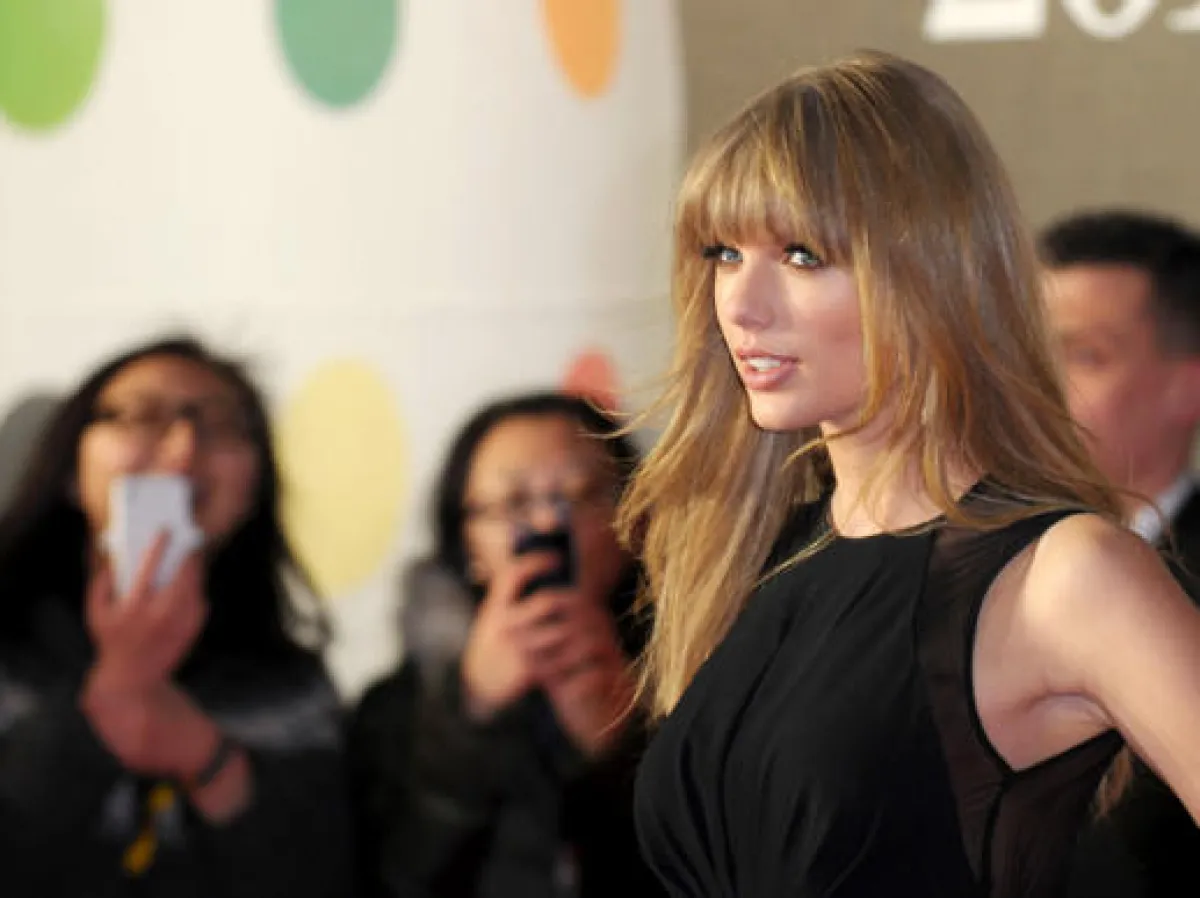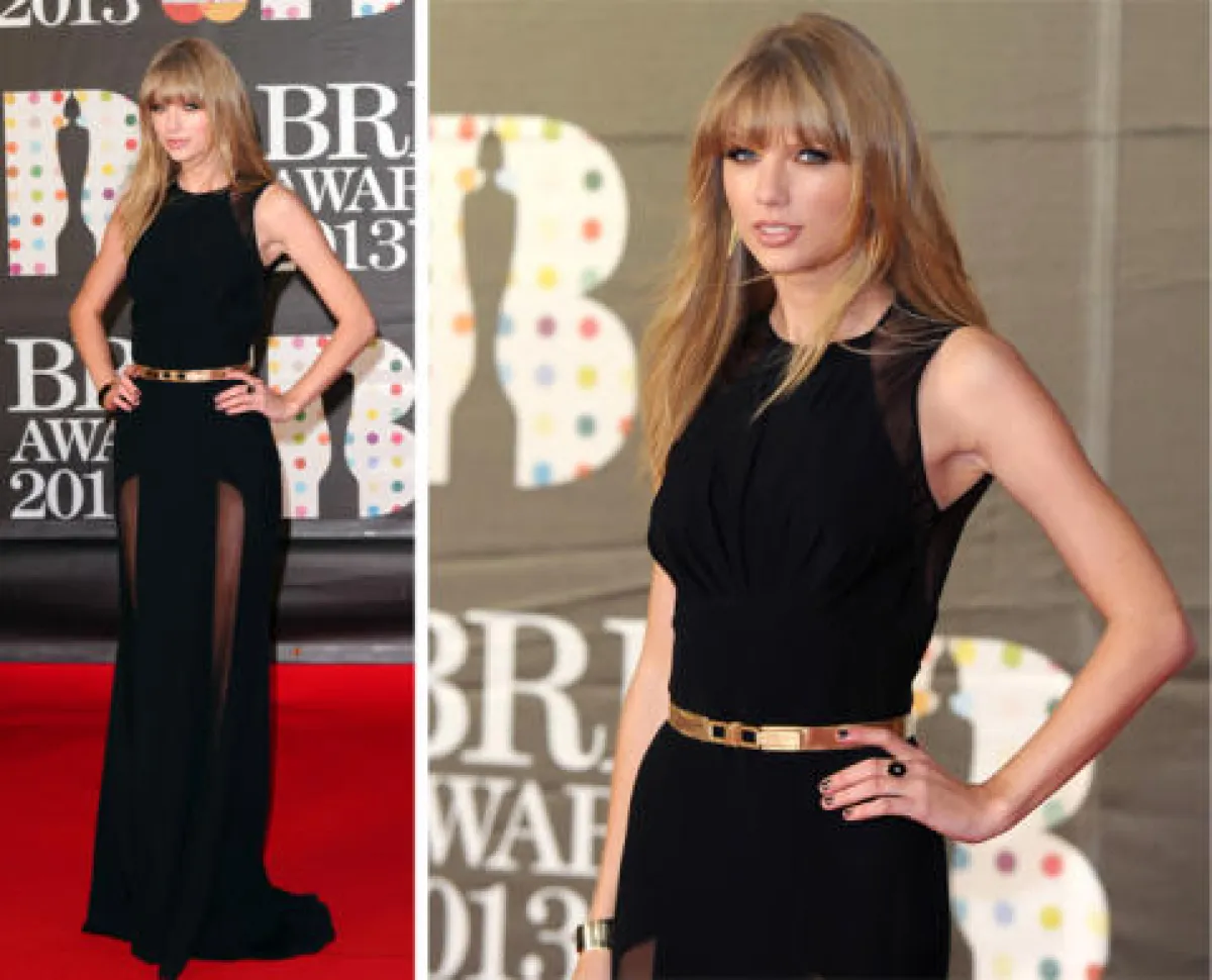 وقع اختيار تايلر سويفت على فستان أسود تزيّنه تفاصيل جميلة من الشيفون وحزام ذهبي أنيق من تشكيلة ما قبل خريف 2013 للمصمم إيلي صعب.