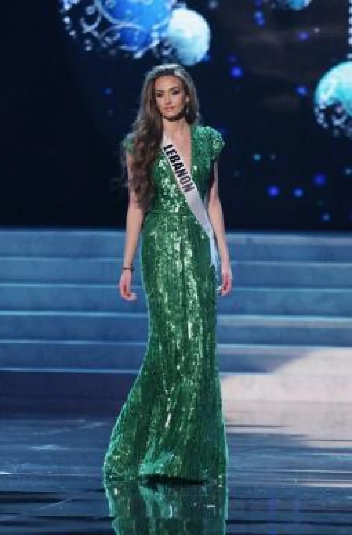 كانت رينا قد ظهرت سابقاً في المراحل التأهيلية بفستان أخضر برّاق من تصميم "إيلي صعب" Elie Saab ..