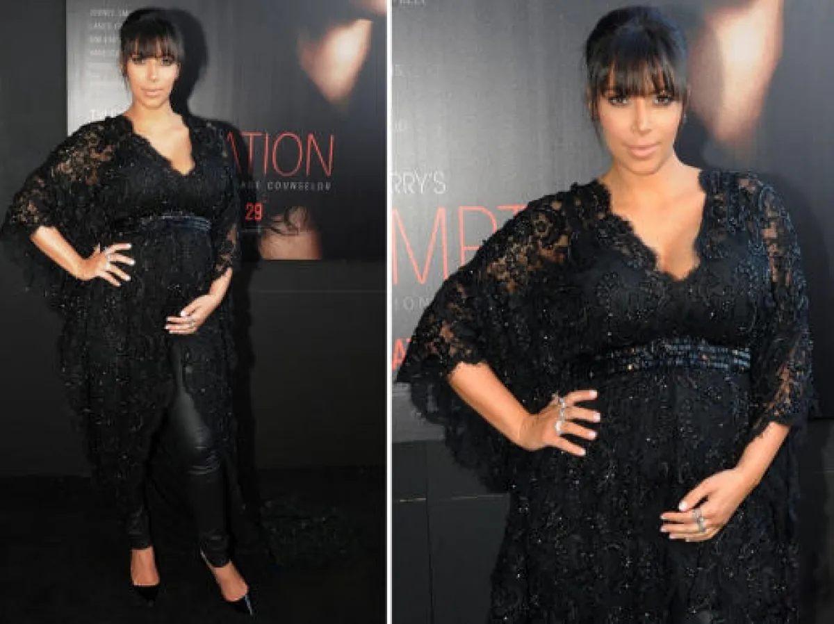 نشرنا سابقاً عن رغبة نجمة التلفاز الشهيرة كيم كارداشيان الشديدة لتجربة ملابس الحمل . ويبدو أن رغبتها قد تحققت مؤخراً ففي آخر ظهور لها عند اطلاق فيلم "Temptation" حيث ارتدت زيّا جذّابا من تصميم منسّقي ملابسها ذكّرنا بتصاميم الجلابيّات الخليجيّة الأنيقة . ميّزته القصّة الأنيقة القصيرة من الأمام والطويلة من الخلف مع التطريز الجميل الذي ظهر عليه.