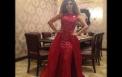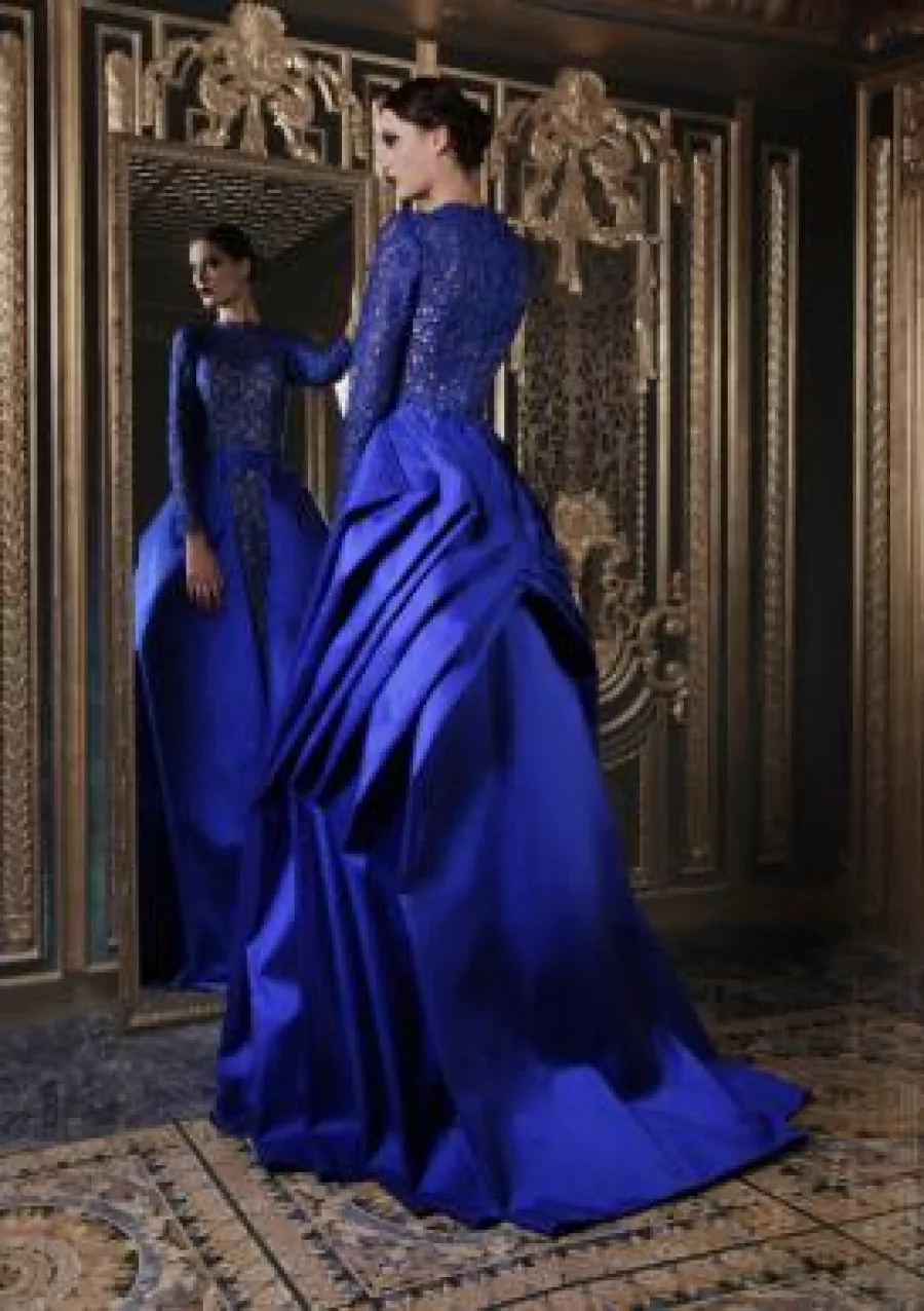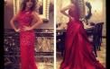 اختارت النجمة أن ترتدي اللون الأحمر بينما عرض المصمم نفس التصميم باللون الأزرق النيلي..