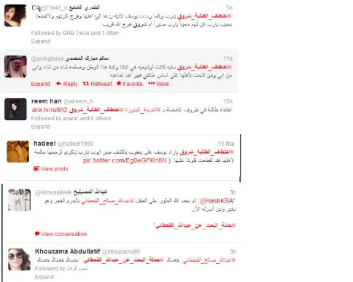 تعاطف المغردون السعوديون بالأمس مع هاشتاغين أحدهما عن #اختفاء _ عبد الله _صالح _القحطاني، والثاني عن #اختطاف _ الطالبة _ شروق، واجتهد الجميع في المشاركة في الهاشتاغين، والدعاء بعودة عبد الله وشروق سالمين.