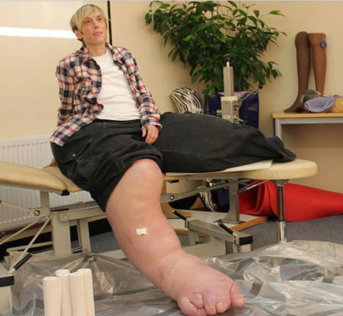 وأفادت صحيفة The sun أن المرأة التي تعرف باسم "المرأة ذات الساق العملاقة"، اضطرت لبتر ساقها اليسرى في عام 2010 يوم بلغ وزنها 32 كيلوغراماً، وأصيبت بالتهاب حاد، لكنها استمرت بالنمو، فيما تضخمت ساقها اليمنى وبات وزنها لا يصدق وهو 108 كيلوغرامات. وأضافت أن "المرأة تخضع لفحوص أملاً منها بالتوصل إلى دواء يعالج هذا الجين الذي يتسبب بتضخم أطرافها".