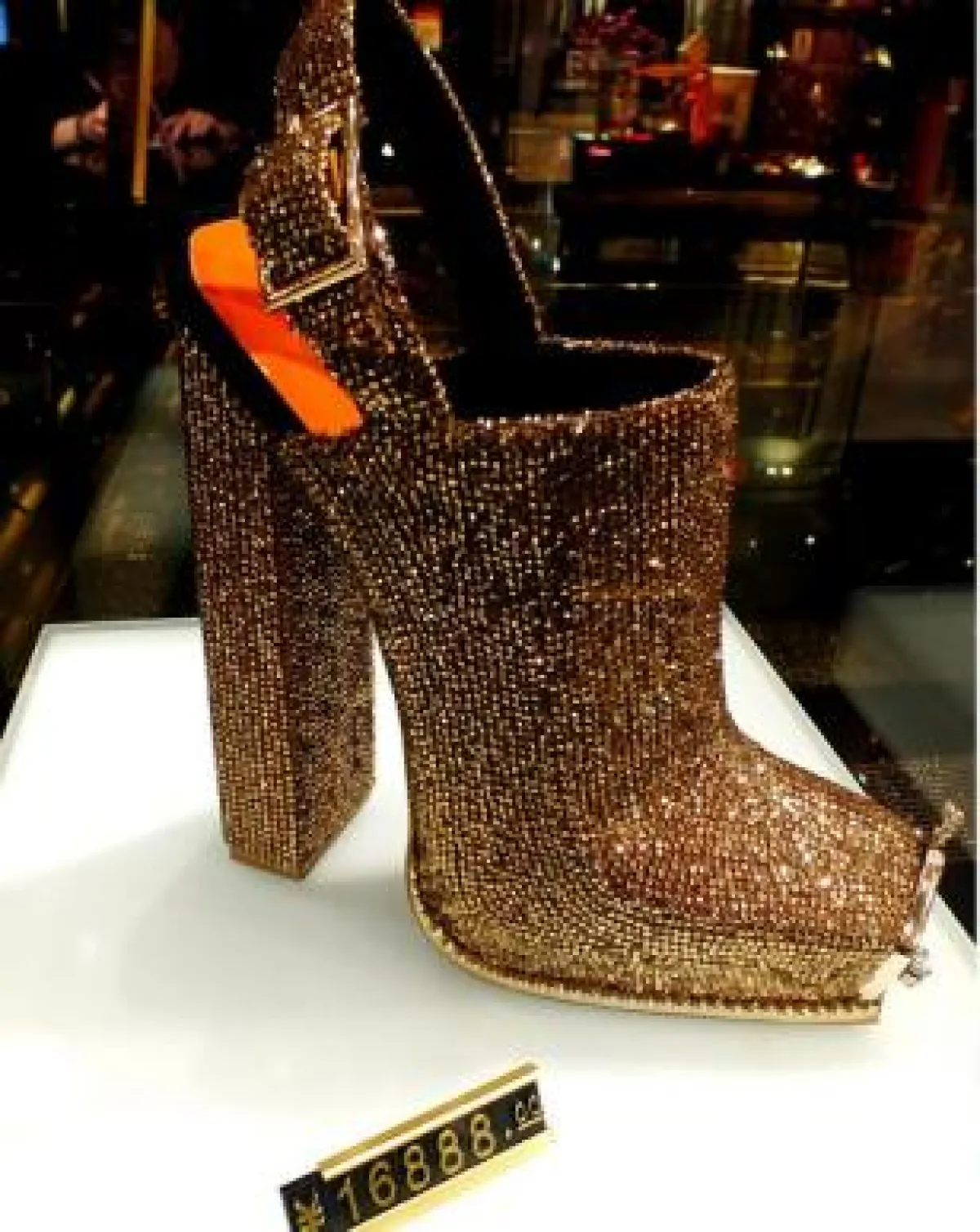 الحذاء معروض للبيع حاليّاً في منطقة "قوانغتشو" في مقاطعة قوانغدونغ الصينيّة، ومُعدٌّ لدخول كتاب غينس للأرقام القياسيّة، باعتباره أطول حذاء ذي كعب عالٍ يحتوي على الكثير من حبّات الماس التي تُزيّنه.