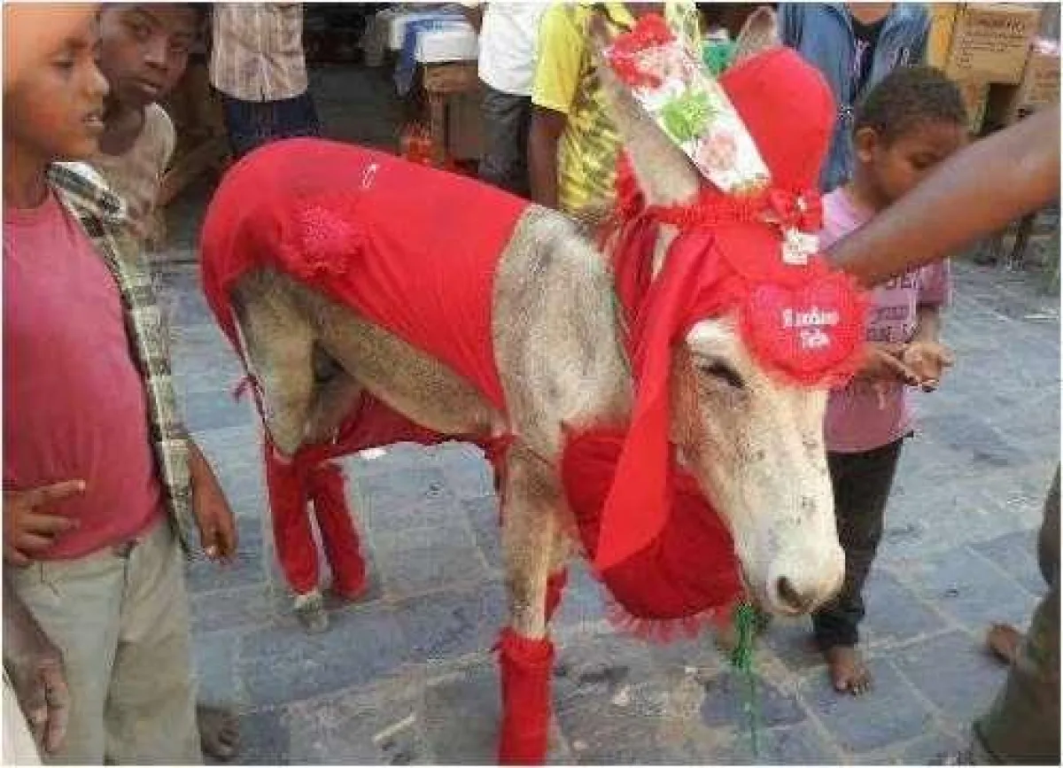 وشارك في الاحتفال، الذي أقيم في أحد الأسواق الشعبية عدد من الرجال والنساء والأطفال، وفضل بعضهم التقاط الصور التذكارية بجانب الحمار.