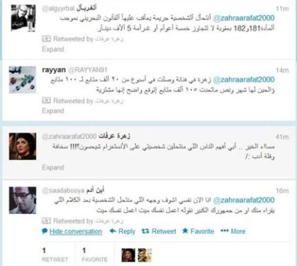 كما ونشرت زهرة تغريدة تؤكد بأن "آنتحآل آلشخصية جريمة يعآقب عليهآ آلقآنون البحريني بموجب آلمآدة181و182 بعقوبة لا تتجاوز خمسة آعوآم آو غـرآمة 5 آلآف دينـآر".