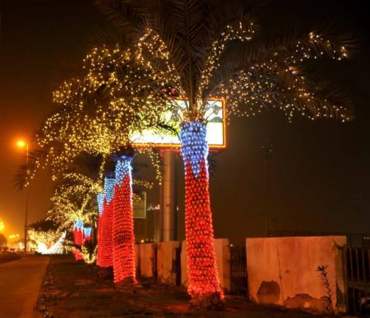 تلألأت سماء البحرين ومحافظاتها الخمس بلؤلؤ منثور في كل مكان زين الأرض والسماء، فاتشحت جدرانها وبيوتها وشوارعها وأشجارها، بالأنوار المضيئة التي غطاها اللونان الأحمر والأبيض، وهما لونا علم البحرين، وخفقت الأعلام عالية تغني للوطن وازدانت البيوت والجدران بصور الملك ورئيس الوزراء وولي العهد، فرحة المواطنين بالعيد زادها فرحة وسعادة شفاء وسلامة خادم الحرميين الشريفين، حيث اقامت الفرق التراثية وفرق العرضة عروضاً بهاتين المناسبتين.