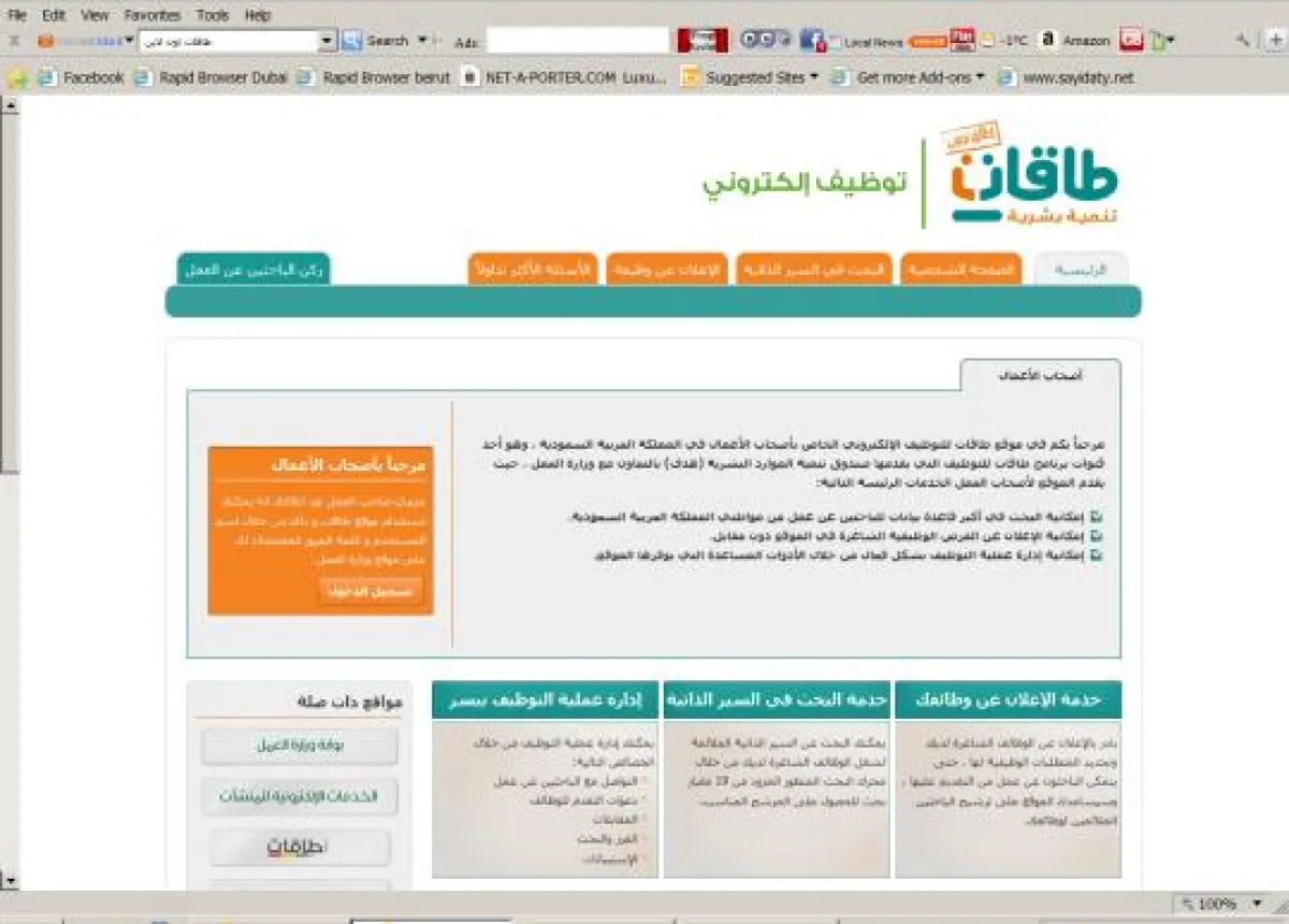 رغم أنّ الموقع الإلكتروني "طاقات أون لاين" لا يزال حديثاً وفي نسخته التجريبية، لكن تقديرات المختصين تؤكد أنه يحتل حالياً المركز الثاني في عدد الوظائف المعلنة، والمركز الثاني في عدد أصحاب العمل المعلنين على مستوى المملكة.. فالموقع هو بـوابة توظيف إلكترونية تقدم خدماتها مجاناً للباحثين عن عمل المسجلين بقاعدة بيانات "حافز"، وبحسب ما نشرت صحيفة "عكاظ" فقد كشف النائب التنفيذي للمدير العام في صندوق تنمية الموارد البشرية "هدف" الدكتور عبد الكريم النجيدي عن أنّ الموقع يعرض حالياً أكثر من 14 ألف وظيفة شاغرة للشباب والفتيات في مختلف مؤسسات وشركات القطاع الخاص على مستوى المملكة، ورغم انتقاد البعض لنوعية ومستوى الوظائف التي يطرحها الموقع، إلا أنّ هذا لا يتعارض مع أنّ هذا الرقم يعدّ جيداً كبداية، ولا بد من وجود من يستفيد من تلك الوظائف ولو بصورة مؤقتة في تأمين حياة ومستوى معيشي أفضل، والصعود على السلم درجة درجة.