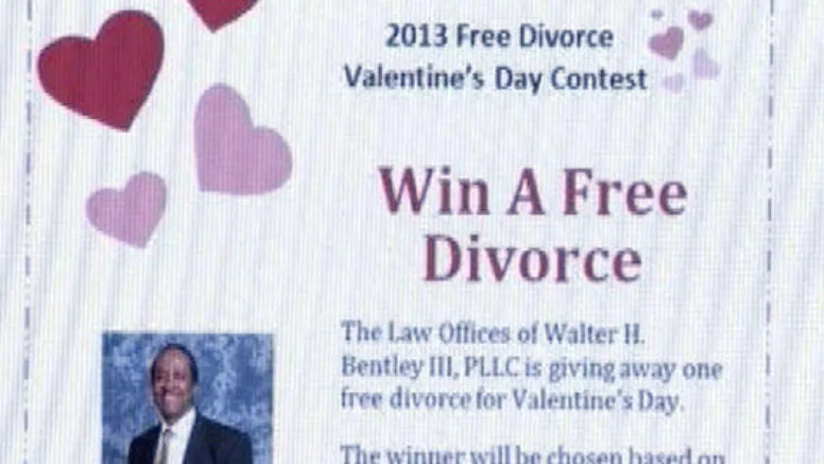 ومع اقتراب عيد الحب الـ"فالنتاين"، دعا المحامي الأميركي وولتر بنتلي، الراغبين في الطلاق، الكتابة إليه لعرض حالاتهم، لافتاً إلى أنه يقدم فرصة للأزواج "المحظوظين" للفوز بعملية طلاق استثنائية ومن دون أتعاب.
