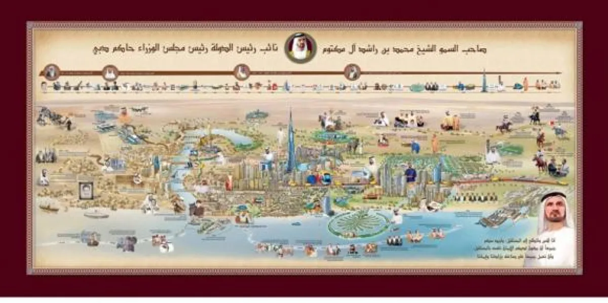 بمناسبة حلول الذكرى السّابعة لتولّي الشيخ محمّد بن راشد آل مكتوم، نائب رئيس الدولة رئيس مجلس الوزراء حاكم دبي مقاليد الحكم في إمارة دبي، كشفت هيئة الطرق والمواصلات، وبالتعاون مع المكتب الإعلاميّ لحكومة دبي، عن إنجاز لوحة تذكاريّة ضخمة، تؤرّخ أهمّ محطّات حياة محمّد بن راشد، في تصميم فنّي يجمع التعبير بالكلمة والصورة، ليُبرز الإنجازات في دبي تحت قيادة سموّه، وفي إطار رؤيته الوثّابة نحو المستقبل، والتي كان لها الفضل في إكسابها مكانتها المرموقة عالميّاً.