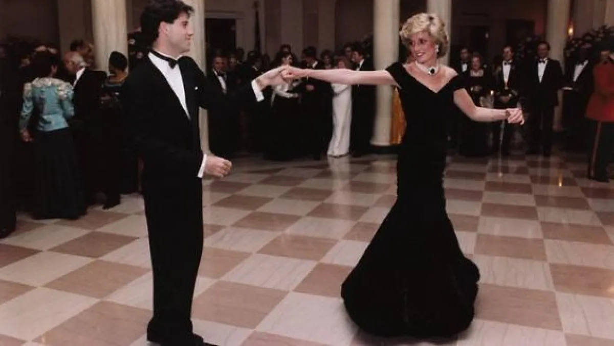 وأضافت دار المزادات "أحد أشهر الفساتين وأكثرها رمزية فستان مخملي أزرق ارتدته في إطار عشاء رسمي في البيت الأبيض أقامه الرئيس "رونالد ريغان" على شرف أمير وأميرة ويلز عام 1985. والمشهد الذي علق في الاذهان من هذه الزيارة لا يعود الى الامير وزوجته بل تظهر فيه الاميرة ترقص مع جون ترافولتا على انغام "يو شود بي دانسيغ" من فيلم "ساترداي نايت فيفر".