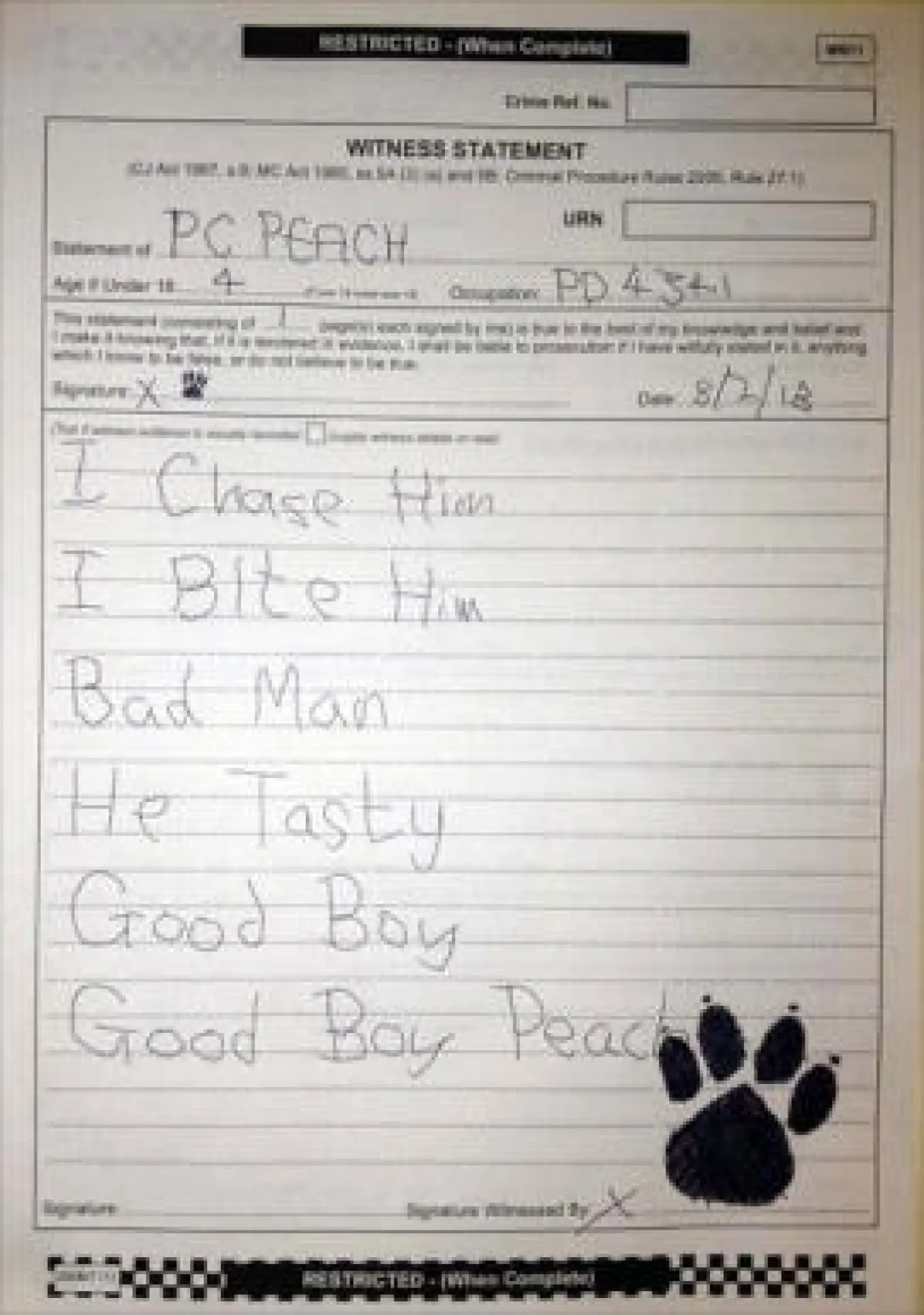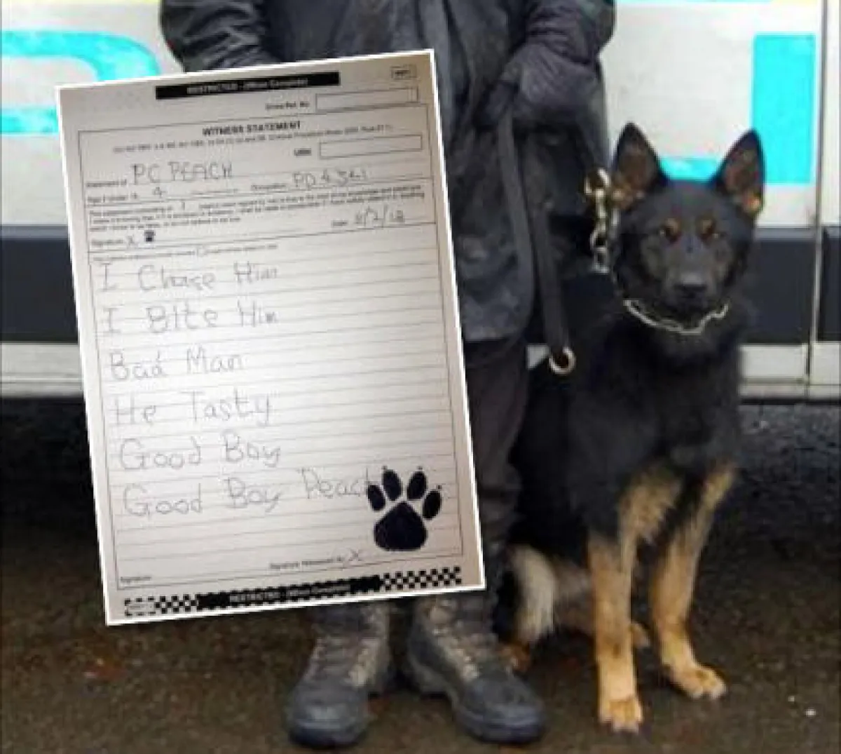 واشارت صحيفة the sunإلى أن الشرطي المرافق للكلب البوليسي فقد صبره، وأعد إفادة بالنيابة عن الكلب حملت بصمة مخلبه وكتب فيها: "طاردت اللص، وقمت بعضه، لأنه رجل سيىء، وأنا كلب جيد".