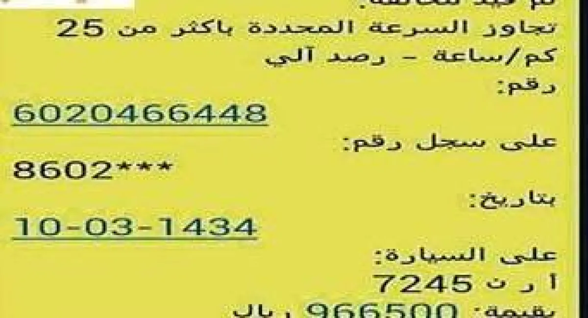 صدمة حقيقية حملتها رسالة على الهاتف النقال للمواطن بسام هلال البلعاسي من مدينة القريات، والتي أفادته بأنّ مخالفاته المرورية بلغت نحو 966 ألف ريال نتيجة تجاوزه السرعة المحددة بأكثر من 25 كيلومتراً على طريق جدة ـ مكة المكرمة استناداً إلى كاميرا (ساهر)، ووفقاً لصحيفة "عكاظ" فقد أوضح المواطن أنه تفاجأ بالرسالة الصادمة التي تحمل هذا المبلغ الخيالي، وغير المعقول إذ لا توجد مخالفة تحمل هذا الرقم الفلكي من المخالفات وفقاً لقوله، لافتاً في الوقت نفسه أنه لم يسبق بأن تجاوز السرعة المحددة، فضلاً عن أنه لا توجد عليه مخالفات مرورية، ولم يسبق أن حصل على مخالفة في الماضي، ودعا البلعاسي الجهات المختصة أن تنظر في أمر هذا الرقم الخرافي من المخالفات، وتعالج الخطأ حتى لا يتضرر منه آخرون.