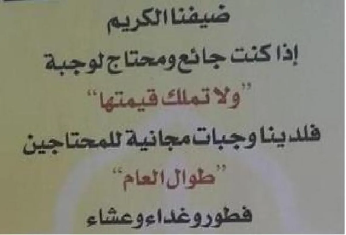 أوصى الله في كتابه الكريم ورسولنا _صلى الله عليه وسلم_ بالصدقة، ومساعدة المحتاجين ولذا نجد دائماً أناساً في الدول المسلمة يعملون بقول الله ورسوله، وهذا مانهجه مطعم في الرياض حيث وضع إعلاناً دعا خلاله الجائعين - غير القادرين - إلى تناول وجبتهم من المطعم مجاناً في بادرة لاقت استحسان النشطاء على مواقع التواصل الاجتماعي الذين تناقلوا صورة للإعلان. وكان المطعم قد كتب في إعلانه: "ضيفنا الكريم.. إذا كنت جائعاً ومحتاجاً لوجبة ولا تملك قيمتها فلدينا وجبات مجانية للمحتاجين طوال العام فطوراً وغداء وعشاء، ما عليك سوى الضغط على الزر والانتظار في الخارج وسوف تصلك وجبتك سفري وأنت ضيف كريم على مطعم السرايا التركي"، متابعاً: "ولا تنسانا من دعائكِ".