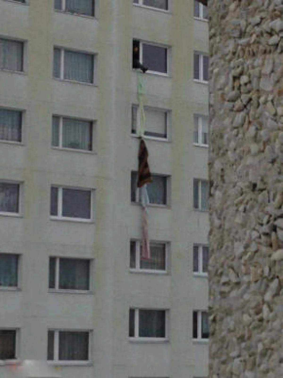 نشرت إحدى المواقع العربية خبراً مصوراً عن رجل روسي أراد الخروج لقضاء الوقت مع أصدقائه إلا أنّ زوجته منعته وأغلقت الباب عليه، فما كان منه إلا أن استشاط غيظاً وفكر في الخروج بأي طريقة حتى خطرت له فكرة متهورة، فربط عدداً من الملابس وأغطية الأسِّرة ليصنع حبلاً قام بإنزاله من النافذة ليستخدمه في النزول، ولكن لسوء حظه وسوء تقديره الحبل كان قصيراً وأوصله للدور السابع فقط، فما كان منه ومن سوء حيلته إلا أن قفز فسقط فوق الشجيرات الموجودة في أسفل البناية، ومن حسن حظه أنه لم يفارق الحياة.