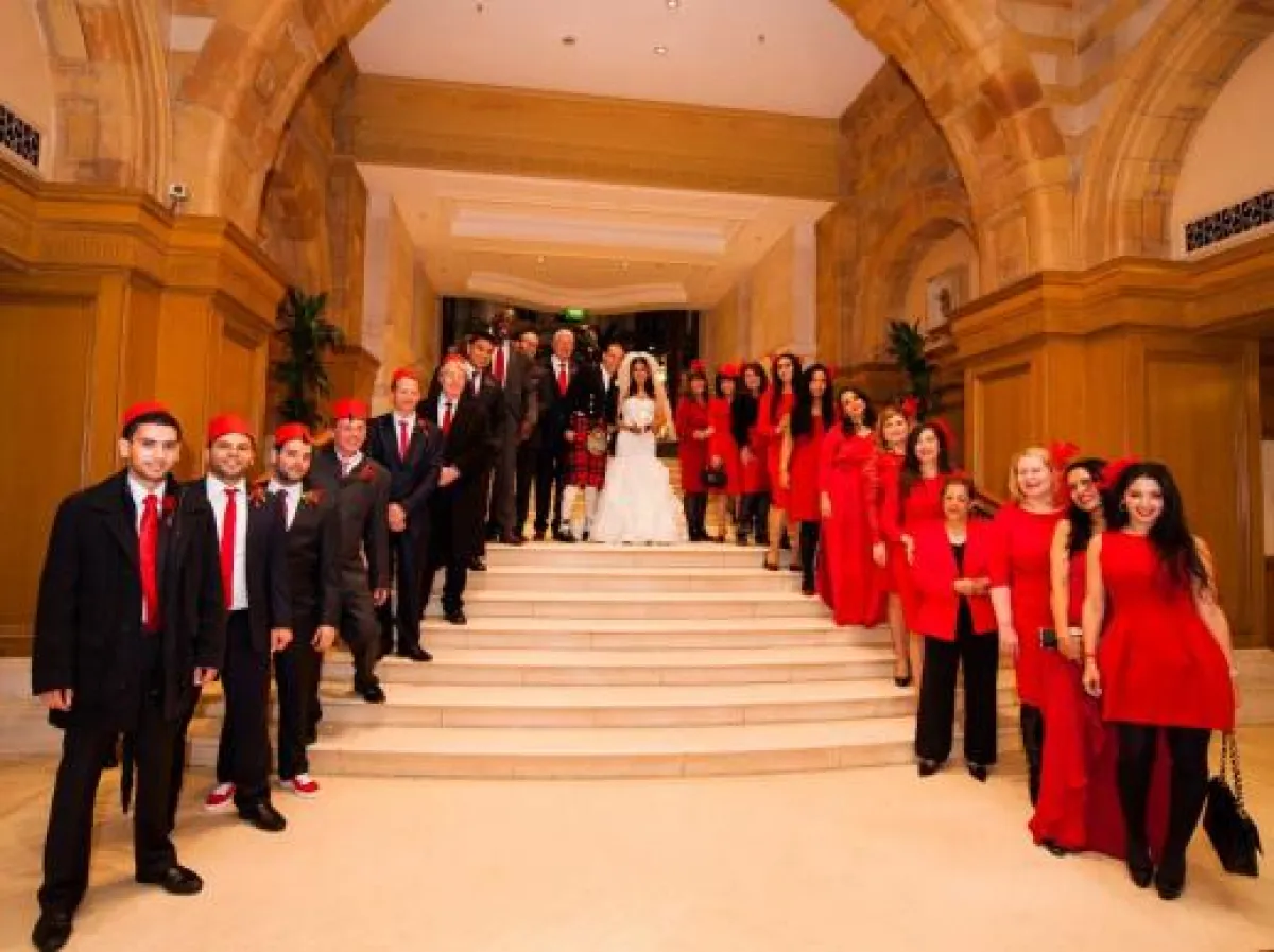 ارتدت سناء خلال مراسم الحفل فستاناً ابيضاً بسيطاً، فيما ارتدى زوجها الزي الإسكوتلندي.