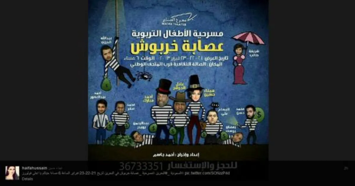تروج الفنانة هيفاء حسين للمسرحيّة الأولى التي تدخلها إلى عالم الإنتاج، عبر صفحتها الخاصّة على موقع"تويتر"، والتي تحمل عنوان"عصابة خربوش"، وتفتتحها على مسرح البيادر في الصّالة الثقافيّة، قرب المتحف الوطني البحريني، اعتباراً من الخميس 21-22-23.