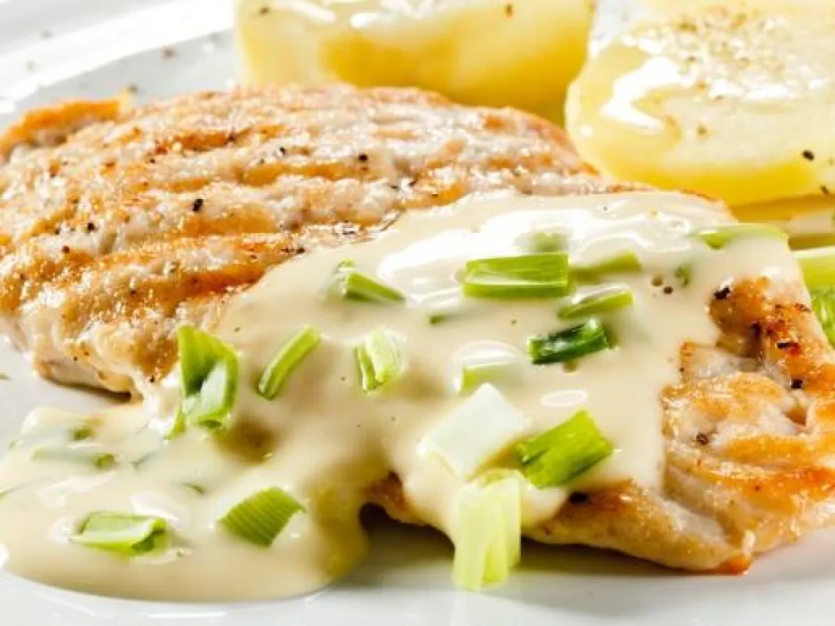 4- يقلى البصل في وعاء يحتوي على الزبدة، حتى يذبل. ثم، يضاف البهار الأبيض والكريما. ويدع هذا المزيج على النار لمدّة خمس دقائق. ثم، يسكب فوق الدجاج.