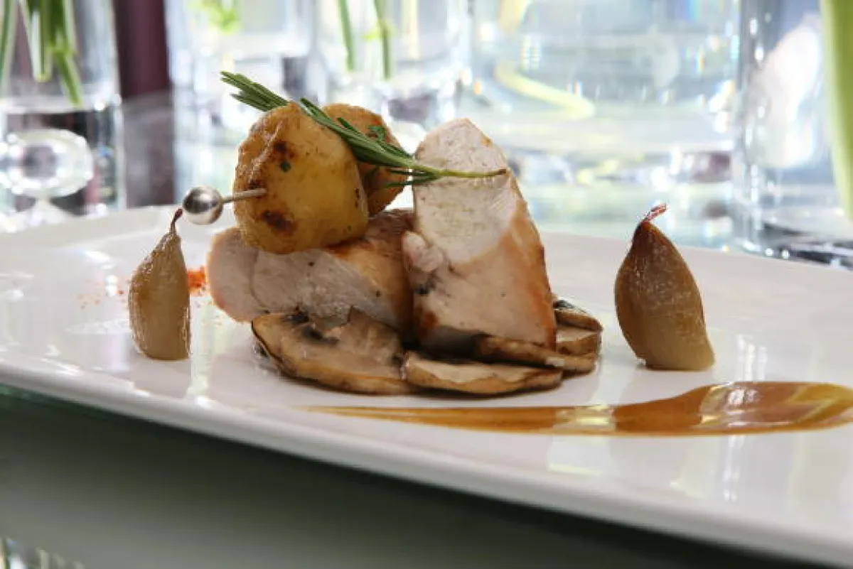 5 -طريقة التقديم: توضع المقلاة على النار، وتضاف الزبدة إليها، وتقلى فيها حبّات البطاطس المسلوقة سابقاً، وذلك على نار هادئة حتى الإحمرار، ثم تضاف حبّات البصل (الكويزات) والفطر الأبيض وتقلى، فالبصل المفروم وملعقة من زيت الثوم، والبقدونس الى حين النضوج.يرفع هذا المزيج عن النار، ويسكب في طبق التقديم العميق، وتقطّع صدور الدجاج الى 4 شرحات متساوية ومعتدلة، وتوضع على المزيج.يزيّن بإكليل الجبل، ويقدّم ساخناً.