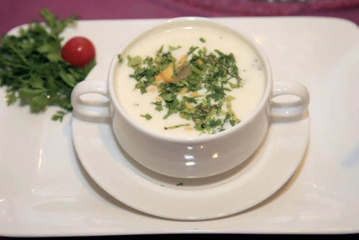 2- يسكب الماء الساخن مع الاستمرار بالتحريك حتى يتشكل خليط متجانس، وتضاف نصف كمية الذرة والكزبرة الخضراء مع الخليط حتى الغليان، فمكعب من مرق الدجاج.ينزع هذا الخليط عن النار، يضرب بالخلاط الكهربائي، ثم يعاد تسخينه، مع إضافة الكمية المتبقية من الذرة والكريما الطازجة، مع التحريك، وينثر الملح والفلفل الأبيض.