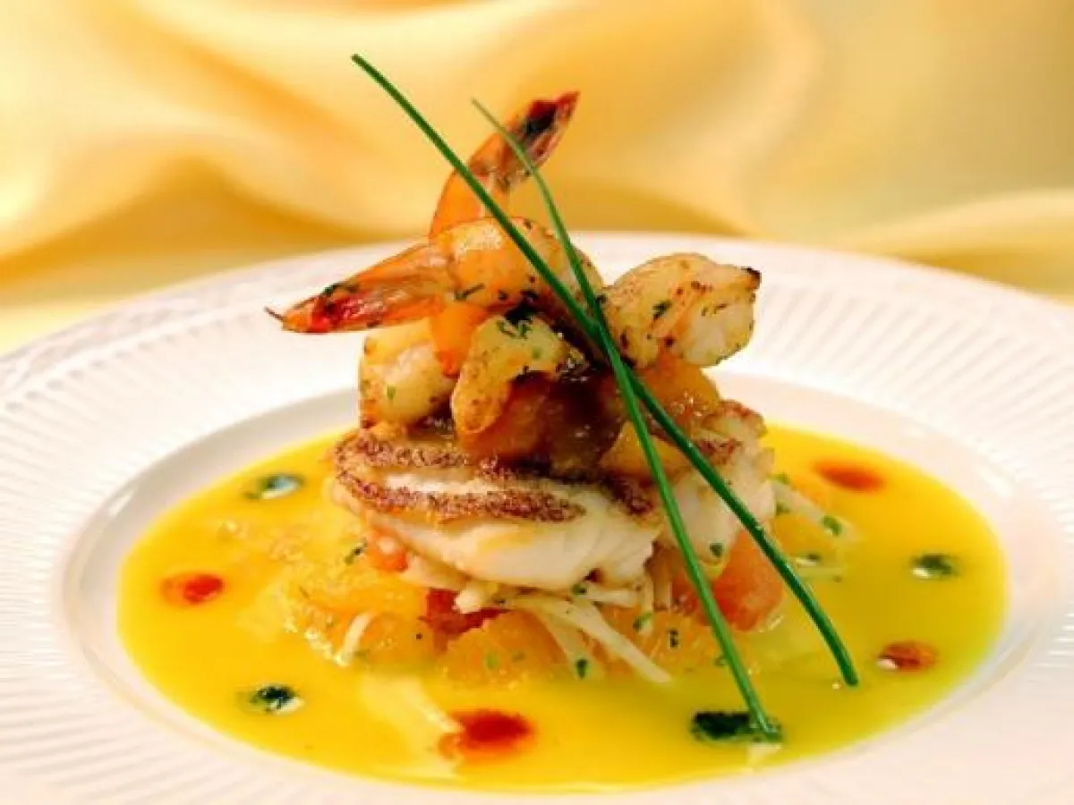3-يسكب حساء البرتقال في طبق التقديم، على أن يضمّ القاع الجزر، ثم يزيّن بالفيليه والروبيان ولبّ البرتقال.