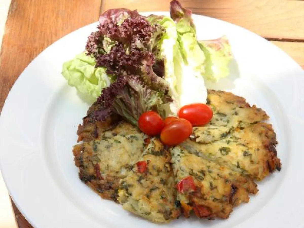 2- في مقلاة، يحمّى الزيت على النار، يقلى البصل.ثم، يضاف خليط الخضر اليه.يقلّب من الجهتين، حتى ينضج.