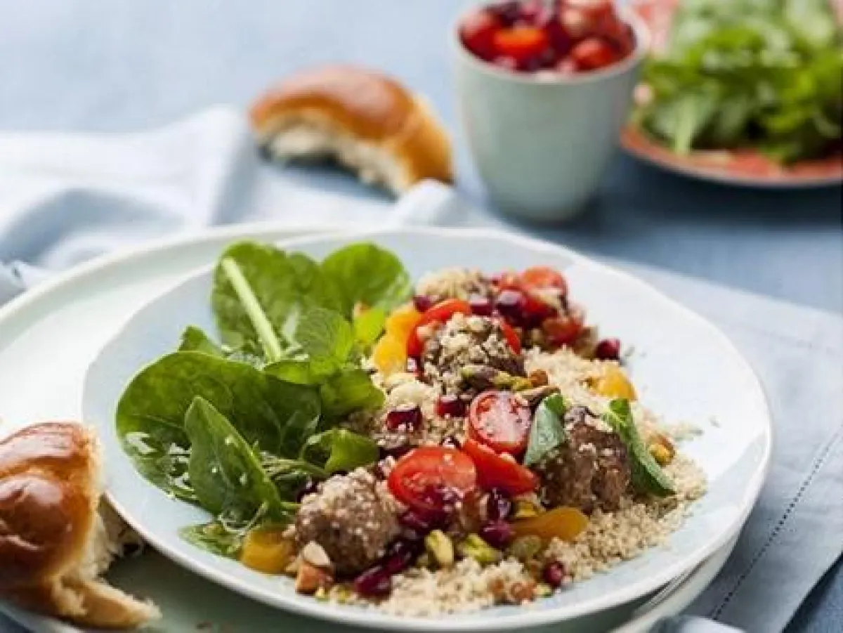 5- للتقديم: يضغط بالشوكة على الكسكس، ثم يوضع في طبق التقديم، مع كرات اللحم والمشمش المجفّف واللوز والفستق المحمّصين وأوراق الخضراوات، وتسكب التتبيلة، ويقدّم هذا الطبق على وجهه الصلصة.