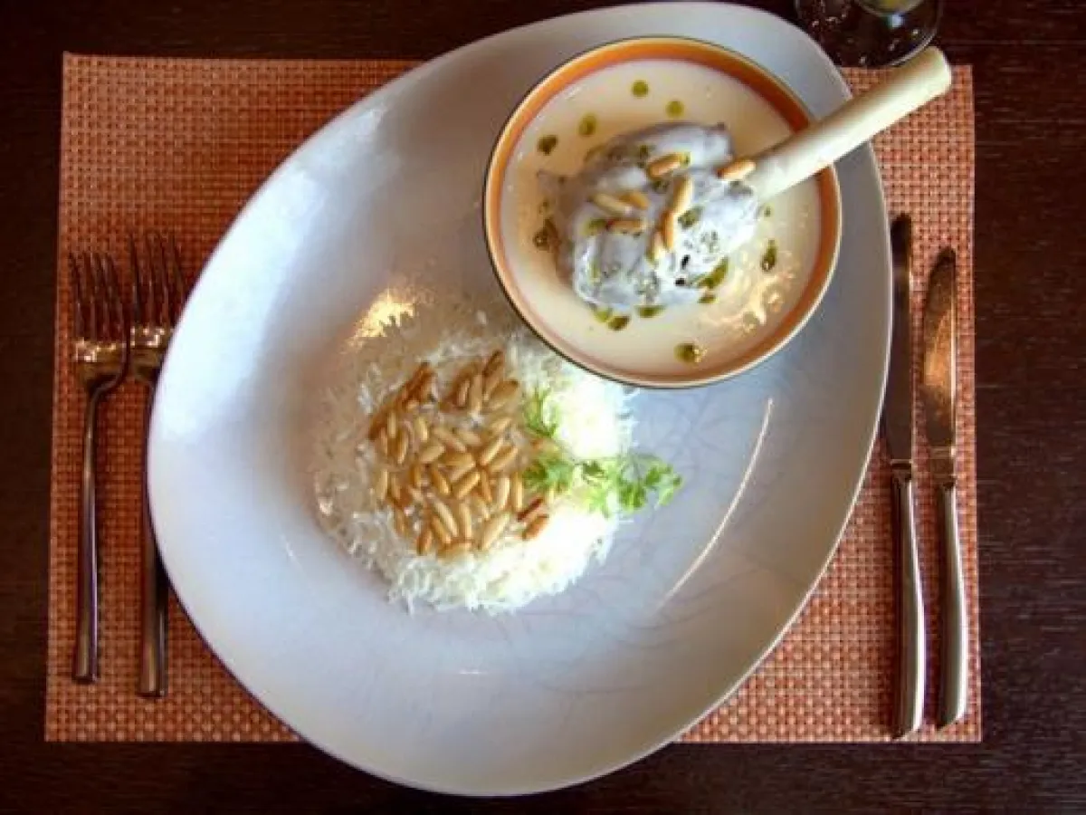 3- لتحضير الأرز:يغسل الأرز ويصفّى جيداً من الماء، ثم يقلى مع الزبدة على نار هادئة.بعدها، يسكب مرق لحم الضأن ويدع هذا المزيج ليغلي.وحينها،تغطّى القدر ويدع المزيج يُطهى على نارهادئة مع الملح، لمدة 15 دقيقة.