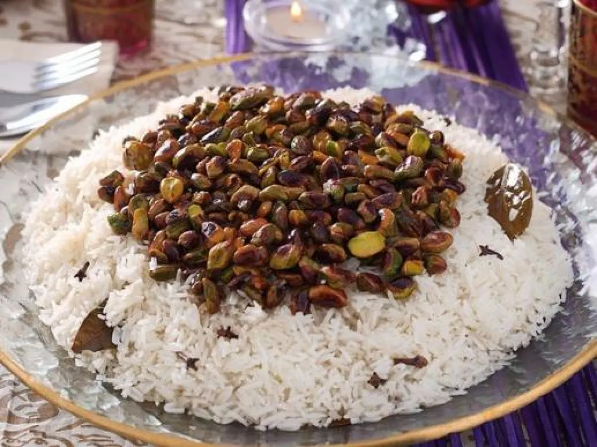 5 - تحمّر الكمية المتبقية من الفستق في الزيت أو السمن، ويضاف إليها العسل مع التحريك، حتى يغطي حبات الفستق. ثم يرفع عن النار ويوزّع على سطح الأرز.