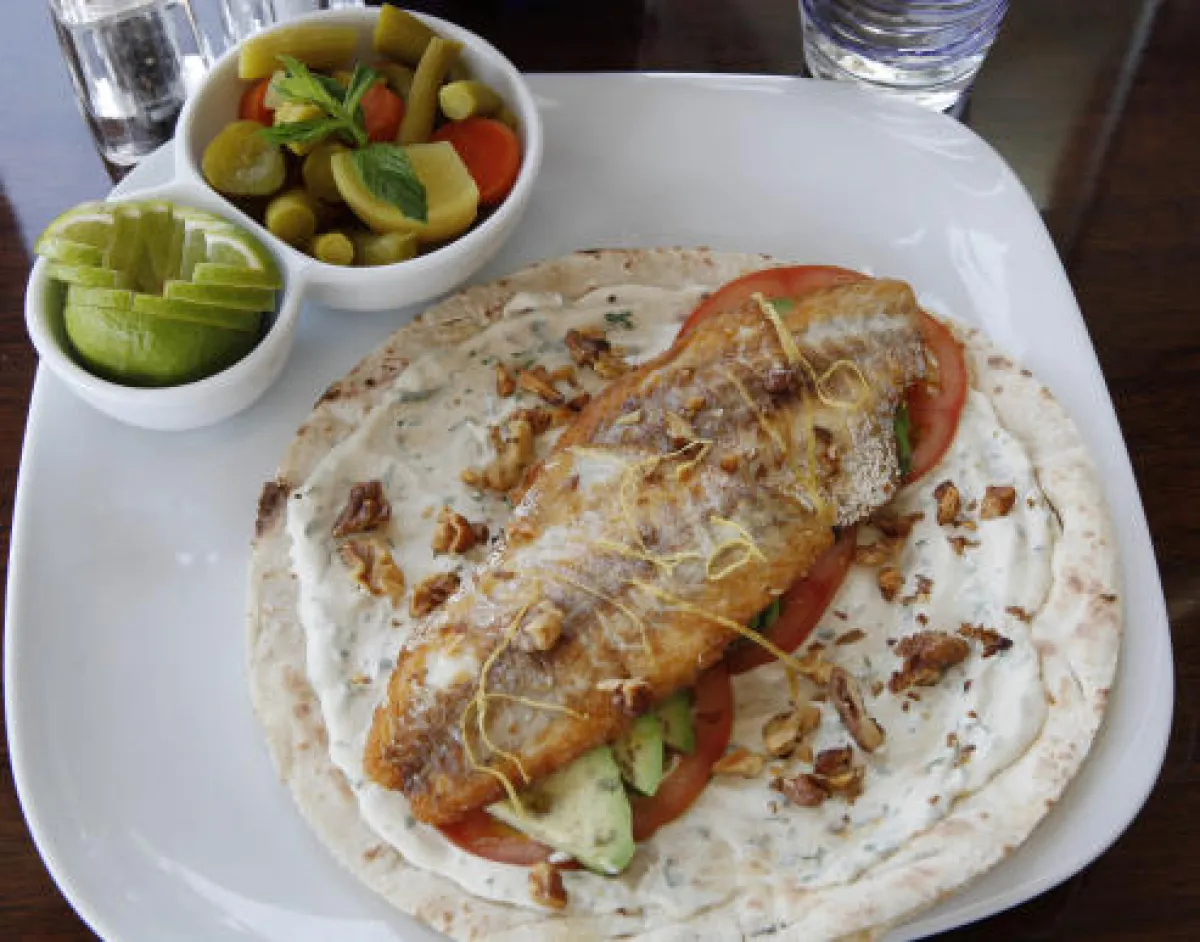 5- في طبق التقديم، توضع أرغفة الخبز العربي، وتسكب الطحينة والجوز المفروم والتوابل فوقها.ثم،تضاف شرائح السمك وحبّات البندورة وقطع الأفوكادو، ويزيّن