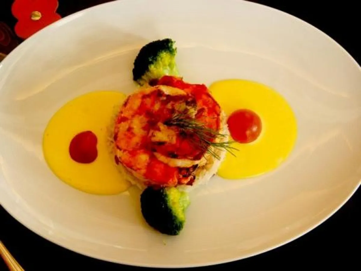 5- طريقة التقديم: يوضع الروبيان في قالب مع الأرز، ثم يقلب في طبق التقديم مع صلصة الكريما. ويزيّن بالبروكلي والبندورة.
