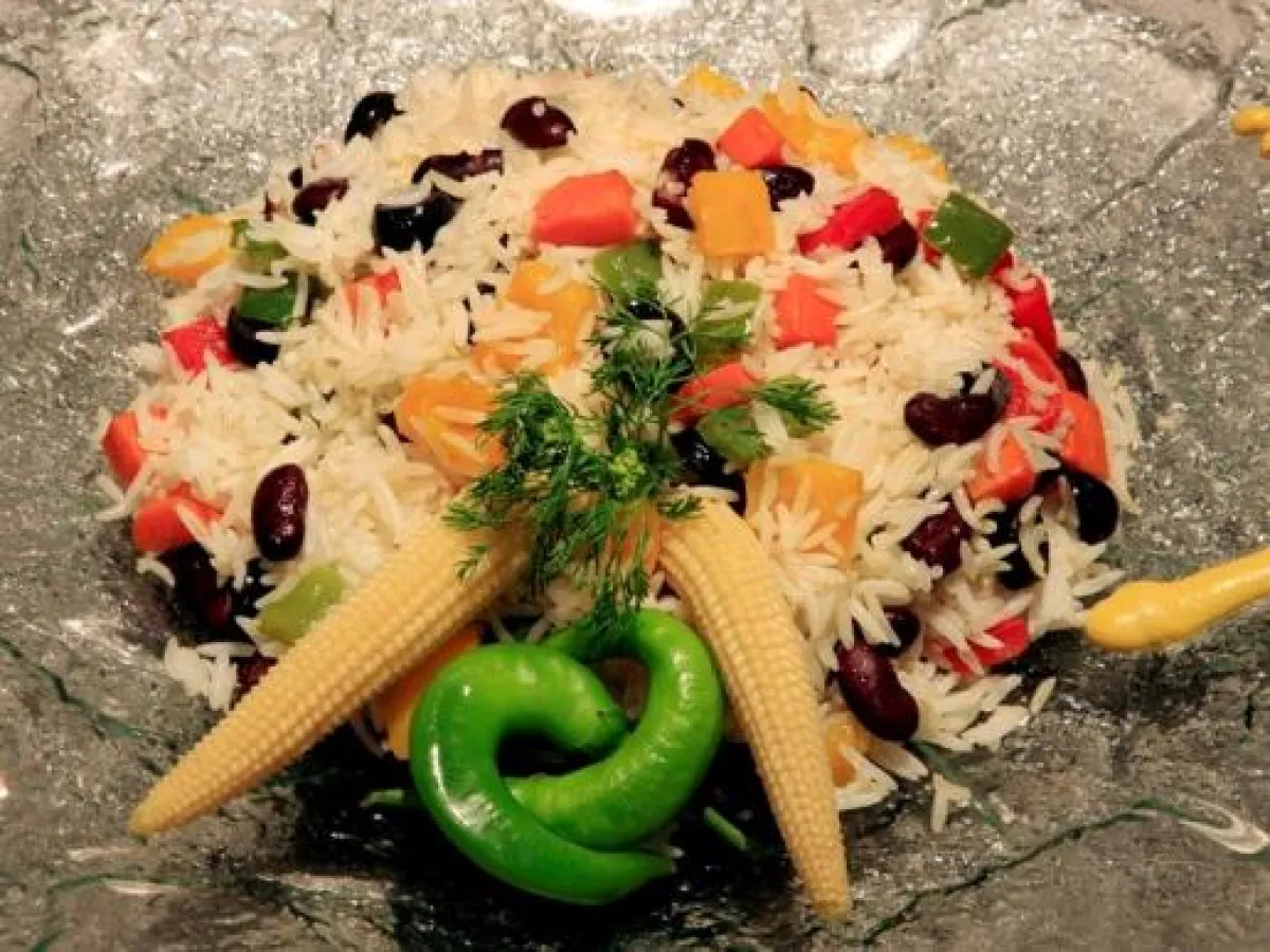 4 -يغسل الارز ويصفى، ويوضع فوق الخضراوات في القدر، ويدع على نار هادئة لمدة 12 دقيقة حتى نضوج الأرز.