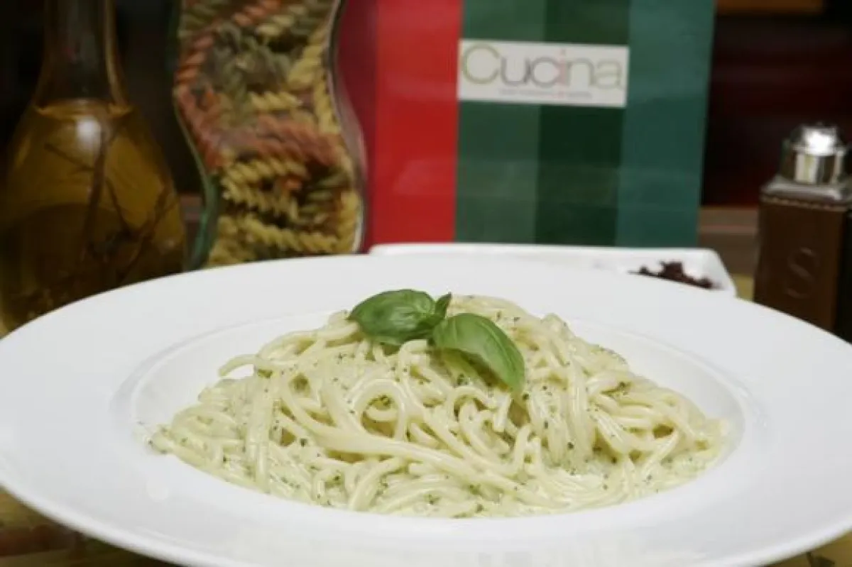 1- يوضع كل من زيت الزيتون, الصنوبر, جبنة البارميزان, الثوم, والحبق في الخلاط.
