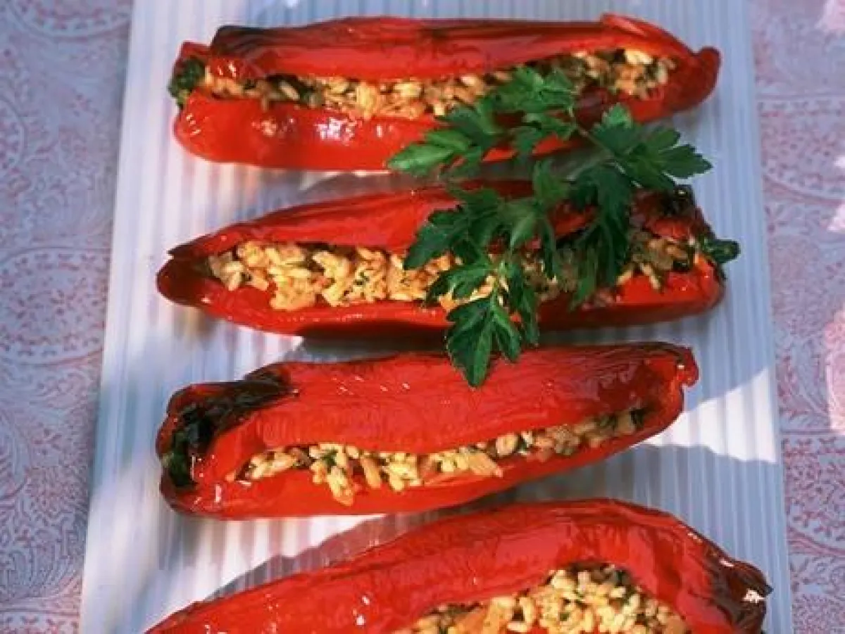 6- تُخبز في صينيّة الفرن لمدّة 30 دقيقة، حتى تصبح حبّات الفلفل ناعمةً والأرّز طريّاً.