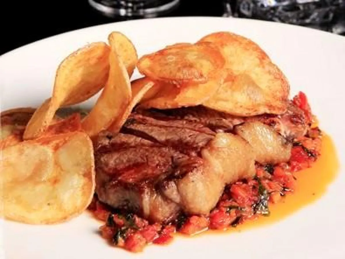 5- في طبق التقديم، توضع صلصة الطماطم والجزر والفليفلة الحمراء والثوم المقلي، يعلوها اللحم، ويزيّن بدوائر البطاطس.