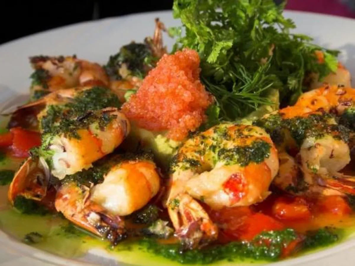 2-في صينية، يضاف الروبيان والكافيار، ويصبّ الخليط. ثم، يتمّ إدخالها إلى الفرن، حتى ينضج الروبيان. ويزيّن هذا الطبق بالبقدونس.