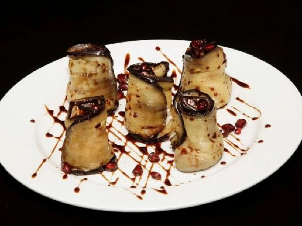 3 -يوضع الحشو على شرحات الباذنجان المقلية، وتلفّ على شكل «رول»، ثم توضع في طبق التقديم ويسكب عليها دبس الرمّان.