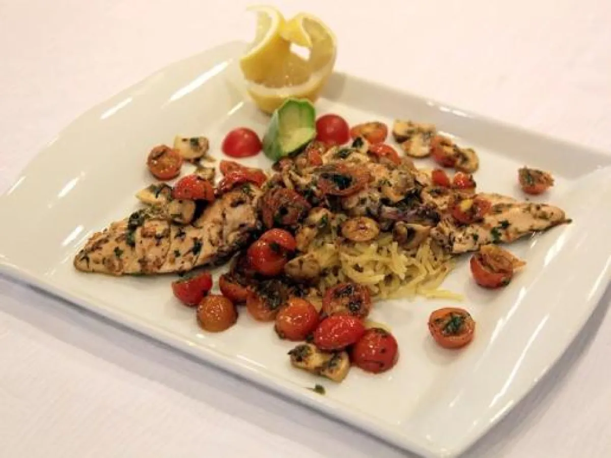 2- تكسّر المعكرونة وتسلق وتوضع في صينية، يضاف إليها الدجاج وصلصته، ثمّ الفطر والطماطم، وتغطّى بالقصدير وتوضع في الفرن لمدّة ساعة.