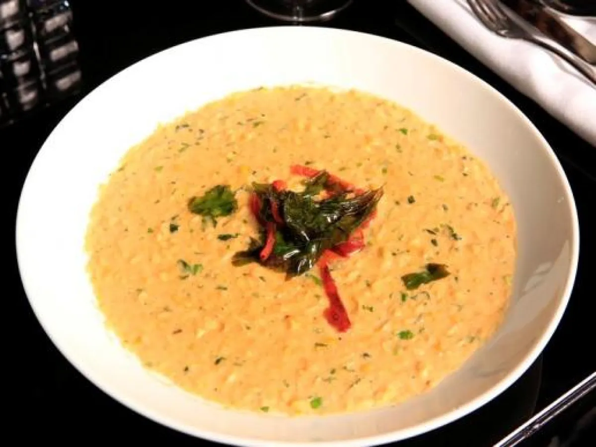 8- يسكب حساء الذرة في طبق التقديم، ويزيّن بأوراق من الحبق والفلفل الأحمر المفروم.