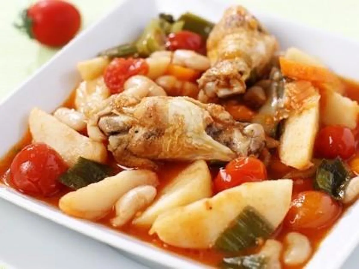 2 -في قدر عميقة توضع على النار، يمزج كل من الدجاج والبصل والفليفلة الحمراء والثوم والفطر والبندورة وصلصة البندورة وخل البلسميك ومرق الدجاج، وذلك حتى الغليان، ثم تغطّى القدر، مع إيداع هذا المزيج على النار لـ 20 دقيقة إضافيّة.ثم، يضاف كلّ من حبّات الفاصولياء ومكعّب المرق، مع التحريك لـ 5 دقائق إضافية. يزيّن بالحبق.
