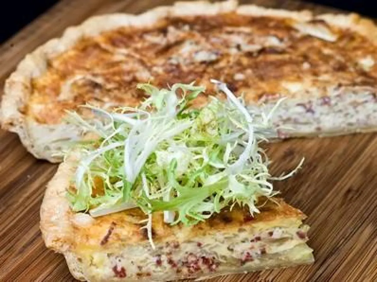 3- في وعاء، يخلط البيض والكريما والملح والبهار معاً، ثم يسكب هذا الخليط على العجينة وعلى الحشو (البصل وشرائح اللحم البقري المدخّن).