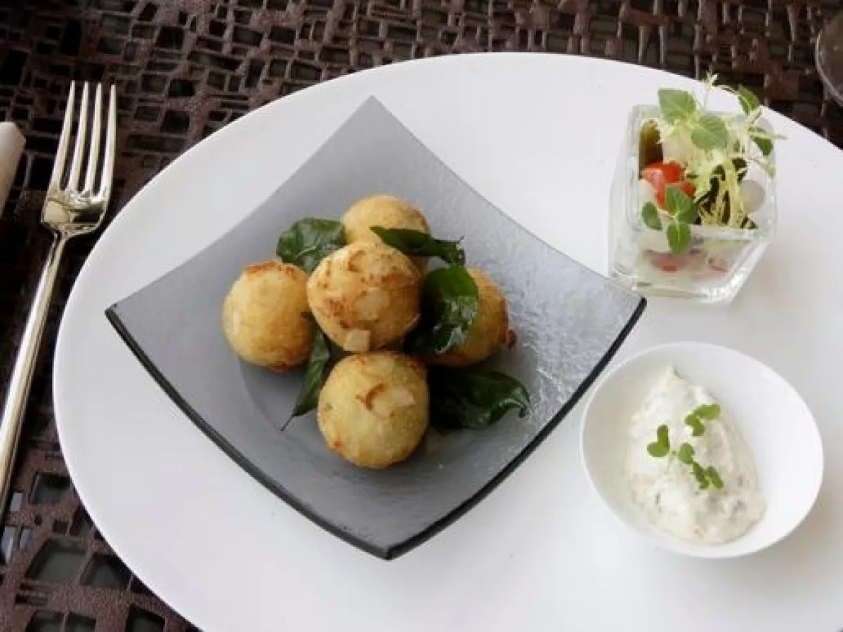 7- أما بالنسبة لطبق المقبّلات، فهو مكوّن من أوراق الكاري المقلية وشرائح الخيار المخلّل والطماطم الكرزية والكزبرة.