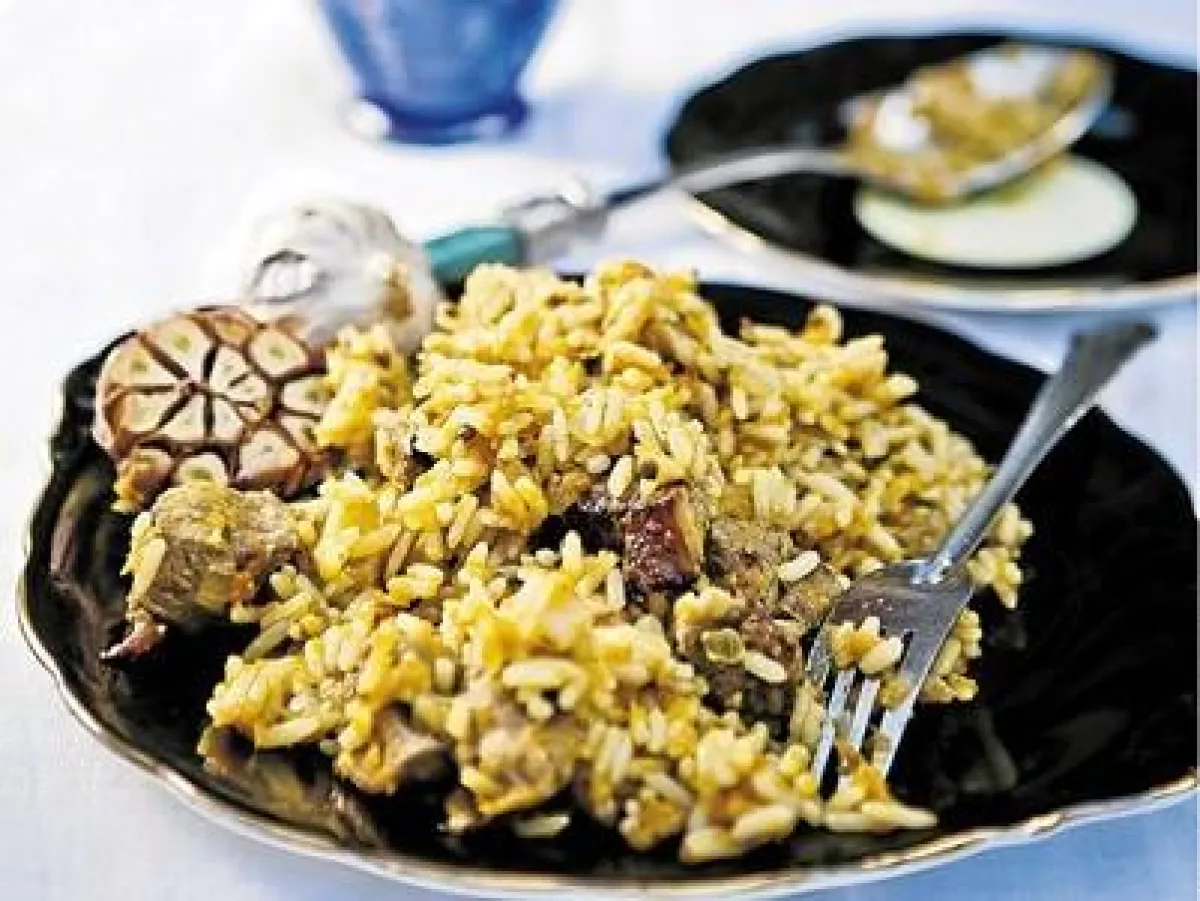 4- تغطّى القدر وتبقى على النار حتى يتشرّب الأرز المرق، مع التحريك بين الفينة والأخرى. ويقدّم هذا الطبق ساخناً.