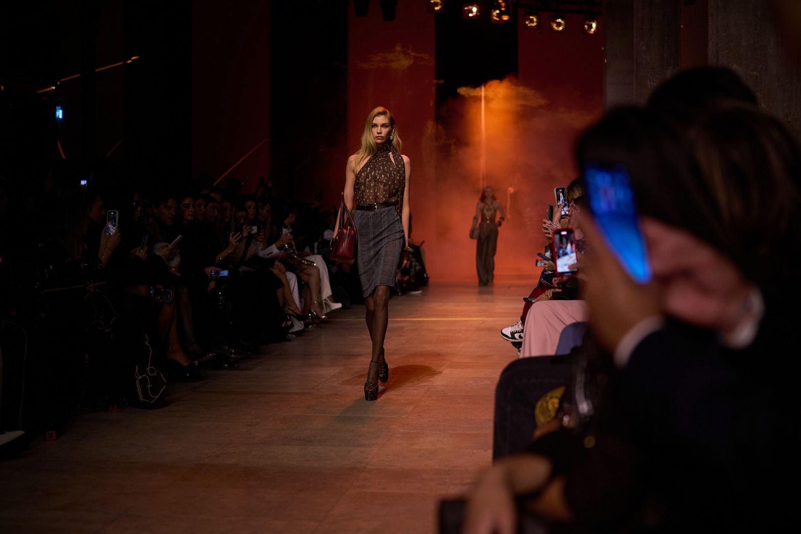كما حملت تأثيرات التدرُّج اللوني، وتقنيات الدرابيه التي تحتضن القوام، والطابع الميتاليكي، سحراً ميّز مجموعته الجديدة؛ فتحوّل مكان العرض إلى احتفال بقوة المرأة العصرية، مقترنة بالأحذية البلاتفورم والحقائب الجلدية المطبعة. ولا ننسى الجوارب الشفافة المنقّطة التي أعادتنا إلى أجواء الثمانينيات في قالب راقٍ وعصري.