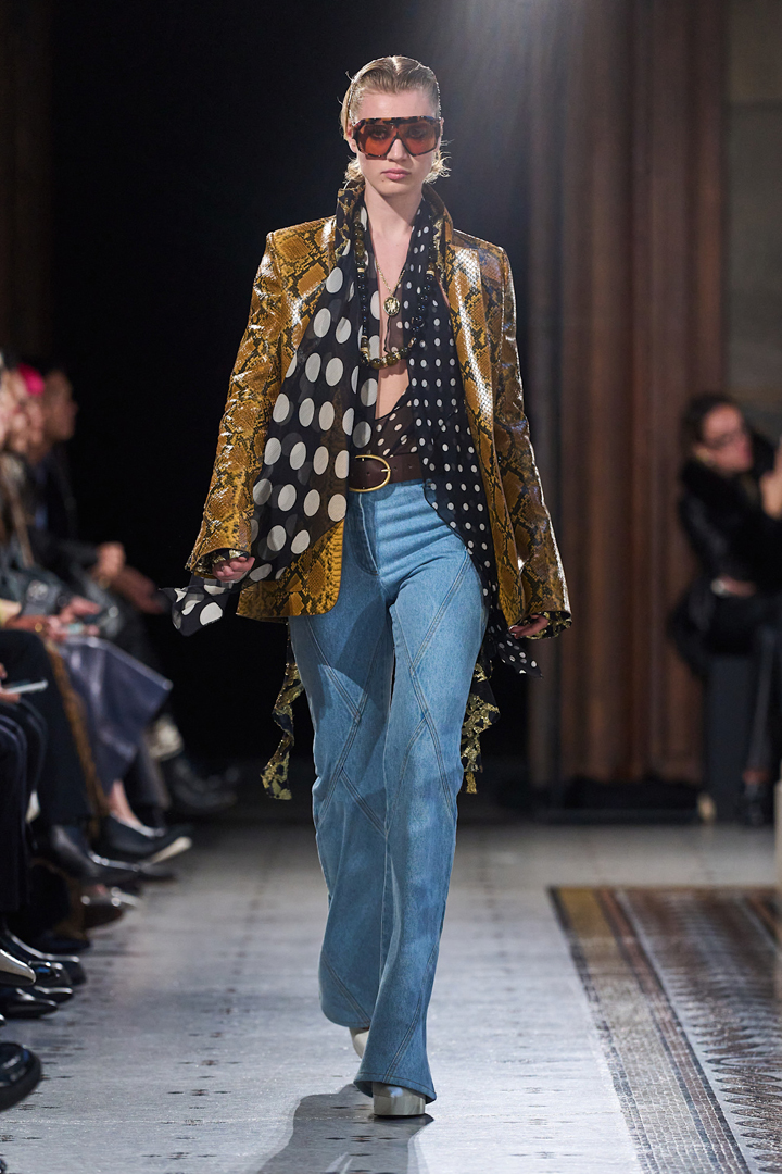 سبق واعتمدنا في مواسم سابقة، نقاط البولكا مع التقليمات. ولكن نينا ريتشي Nina Ricci رفعت سقف الجرأة هذا العام، بعدما أرسلت إحدى عارضاتها إلى المنصة مرتدية بلوزة شيفون سوداء مطبعة بنقاط البولكا، منسّقة مع بليزر بطبعة جلد الأفعى. وقد جاء البنطلون الجينز ببساطته ليُبعد الطلة عن المبالغة.