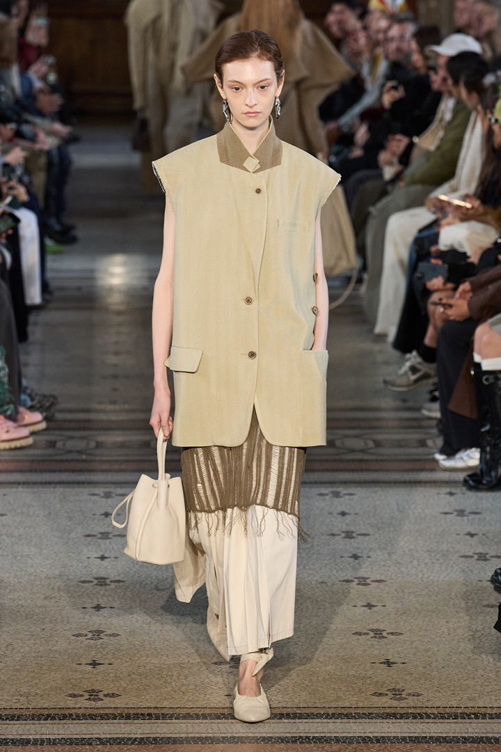 لم تغِب الأزياء البوهيمية عن المنصات الباريسية، ولكن حضورها كان أقلّ مقارنةً بما شاهدناه في ميلانو. استحضرت غابرييلا هيرست Gabriela Hearst هذا الستايل في مجموعة ربيع وصيف 2026 بتشكيلة من الإطلالات، أحببنا منها الطاقم السويد الجملي المكوّن من معطف طويل مهدب، وتنورة ميدي بشق أمامي، والأهداب تتدلى من حوافّها أيضاً.