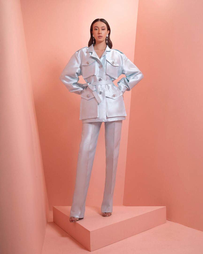 وللنساء العصريات هناك البدلة الباستيل بطابع البيجاما الحريرية، أو الثلجية المصنوعة من الحرير من تصميم زياد نكد، وتتألف من سترة مستقيمة مريحة بأزرار معدنية وأكمام طويلة ومنسقة مع سروال طويل بساقين مستقيمتين.
