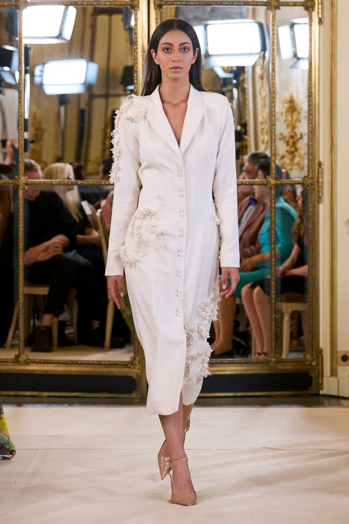 وللنساء اللواتي تستهويهن قصة البليزر إليك هذا الفستان الذي يجسد قصة البليزر الطويل، وهو من تصميم مشاعل مطاوع، ويتألف من الكريب الأبيض وهو مطرز بخيوط من الخرز البراق ويتسم الفستان- البليزر بقصة ميدي تمتد فوق الكاحل بقليل، ويمكنك انتعال حذاء T Strap من الجلد اللامع النيود بكعب عالٍ.