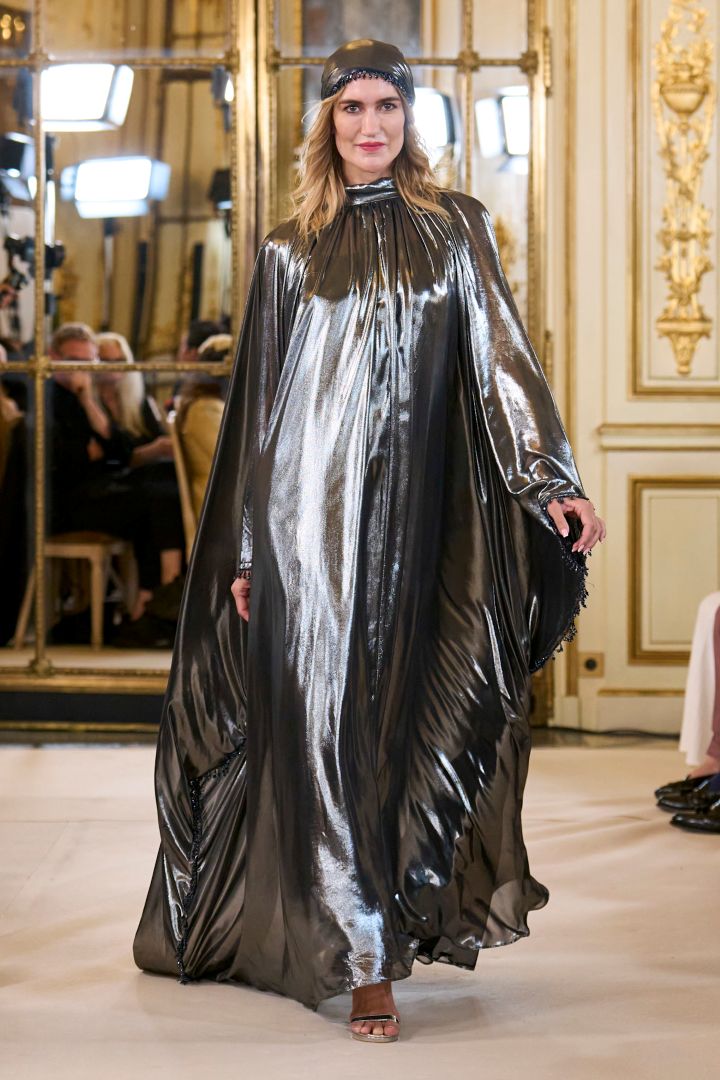 كما اخترنا للراغبات في التميز إطلالتين واحدة تتألف من عباية لاميه بقصة مكسرة عامودية، وتتسم بطابع واسع من دون تحديد للأكمام وتنحدر نحو الأسفل، ويمكنك تنسيق توربان من القماش نفسه لتعزيز طابع الزي الشرقي الذي حمل توقيع دار هوماريف Humariff، ويمكنك انتعال صندل ميتاليكي معها.