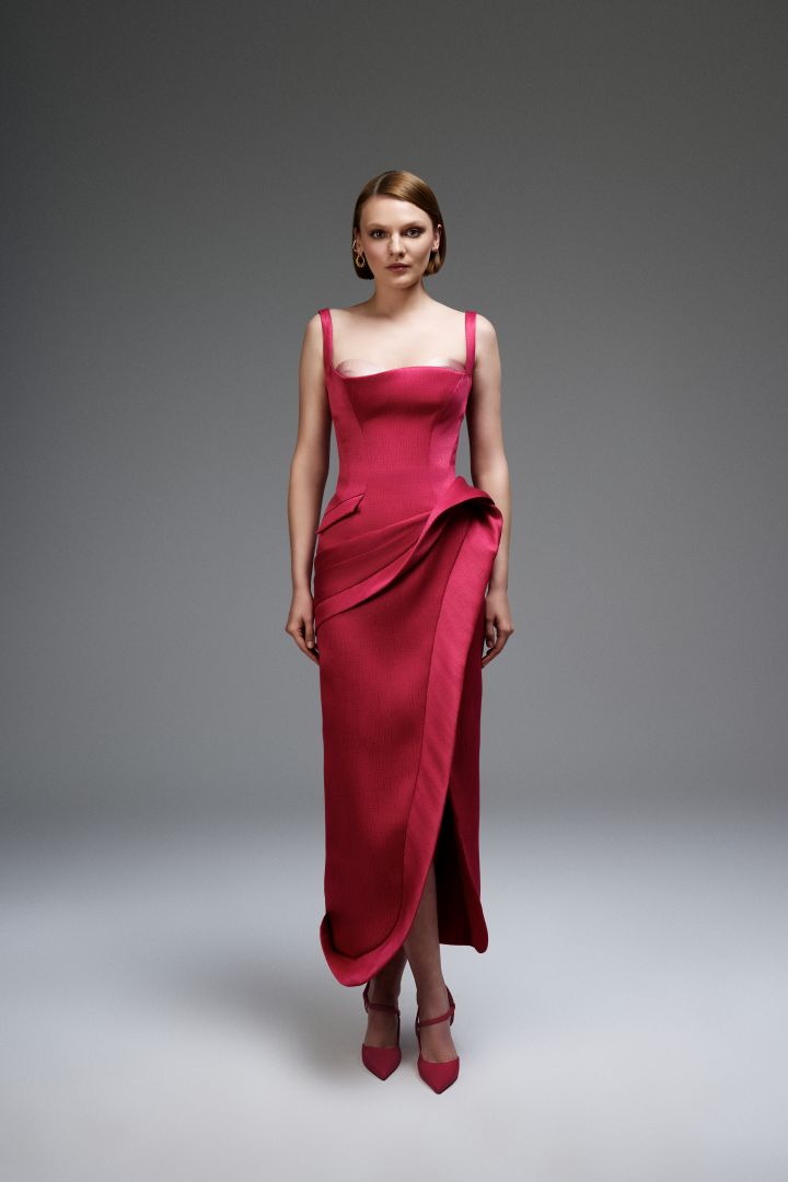زي من إيلي عواد- الصورة من العلاقات العامة - اختاري فستانك حسب لون الشعر: للشعر البني والأسود ابتاعي فساتين باللون الزمردي والياقوتي الأزرق والبرغندي. جربي الأبيض والبني الفاتح والكراميل ويمكنكِ أيضًا اختيار ألوان جريئة مثل الفيروزي والوردي التوتي.